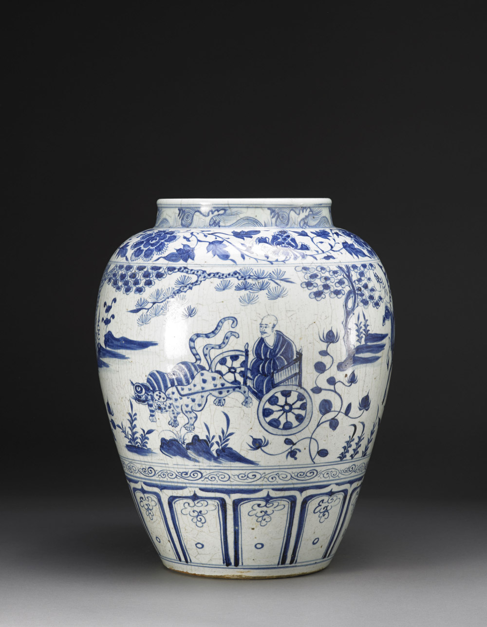 Grande giara in porcellana bianca e blu, decorata con Guiguzi che scende dalla montagna per salvare il suo studente Sunzi detenuto dagli Yan Cina, fine XIX/inizio XX secolo A blue and white porcelain jar, decorated with the story "Guiguzi climbing down the mountain" in order to save his student Sunzi, who was held by the Yan China, late 19th/early 20th century (h cm 41)