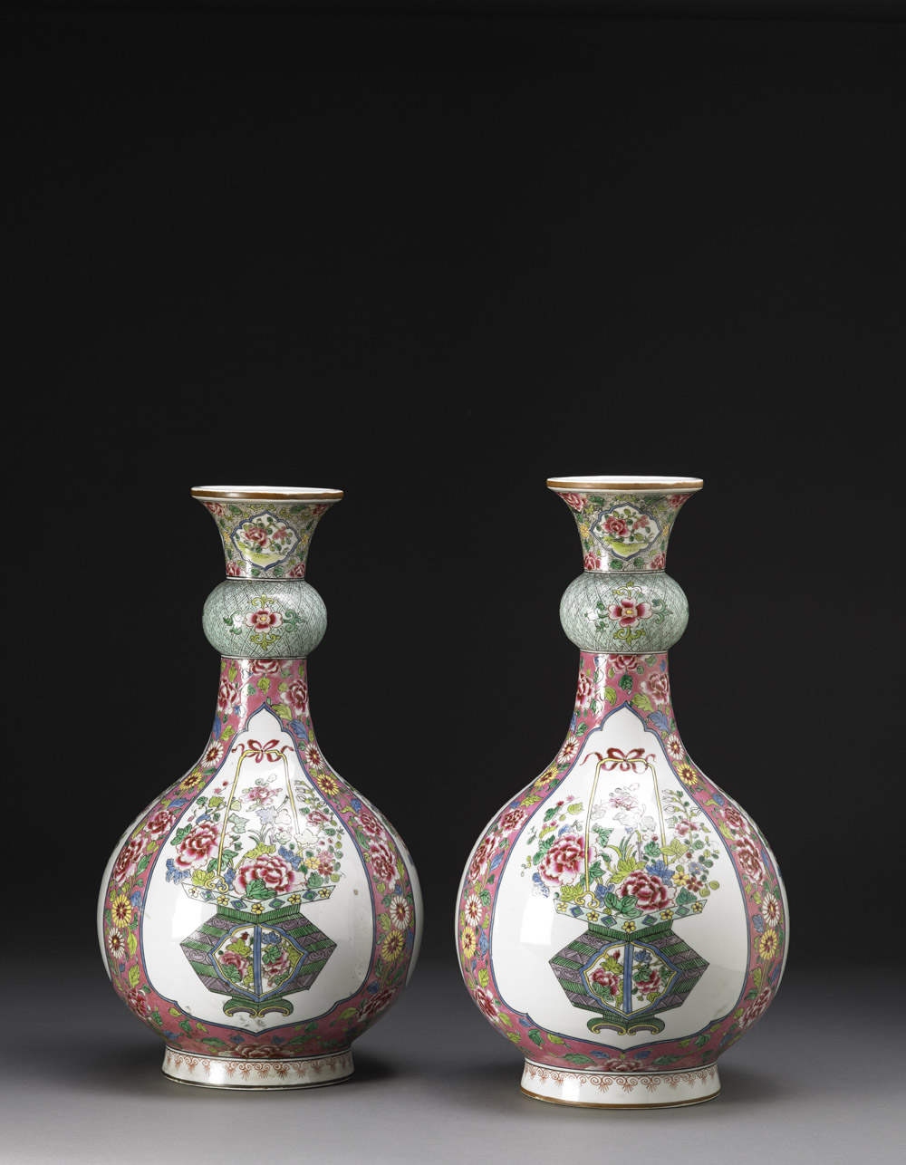 Coppia di vasi a bottiglia in porcellana Famiglia Rosa, il collo "a bocca d'aglio" svasato, decorati con riquadri centrali con cesto di fiori, su un fondo rosa scuro con ricca decorazione floreale con peonie e crisantemi Cina, sec. XIX A pair of Famille Rose porcelain bottle vases, with flaring garlic-mouth neck, each decorated with a central rectangular panel with a basket of flowers, reserved on a dark pink ground with rich floral motif comprising peonies and chrysanthemum China, 19th century (h cm 43)