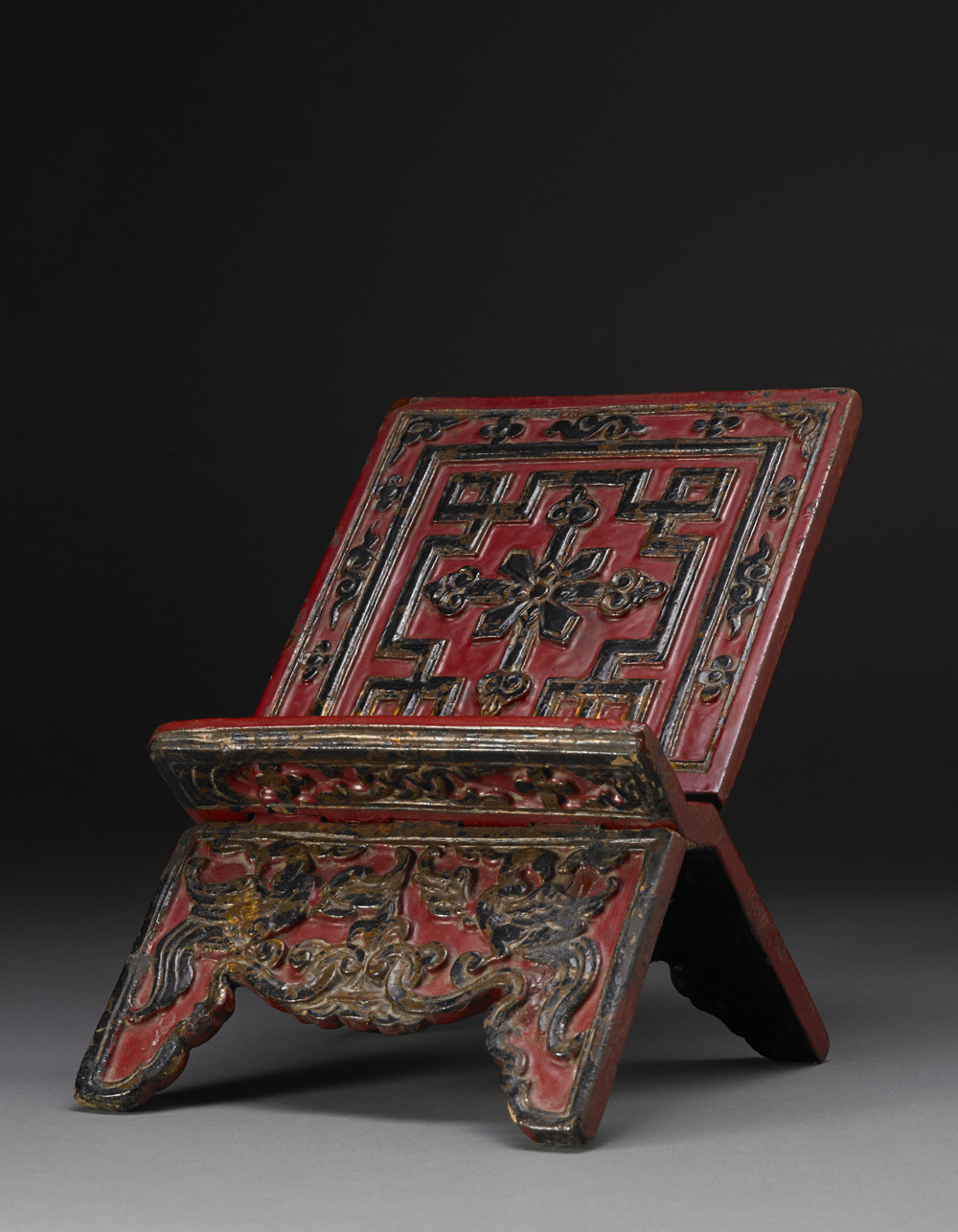 Leggio per bibbia ad un anta in lacca rossa e decorazioni dorate, l'anta intagliata all'interno con una croce inserita in una bordatura geometrica, l'esterno con decoro geometrico a quattro punte, la base intagliata con coppia di uccelli dalla lunga coda e fiori Cattedrale di Phat Diem, Vietnam, sec. XIX A red lacquer bible stand with gilt decoration, carved with a cross inset in a double geometric border to the interior, the exterior with a further geometric pointed motif, the stand with a pair of birds and flowers Phat Diem Cathedral, Vietnam, 19th century (cm 28x23)