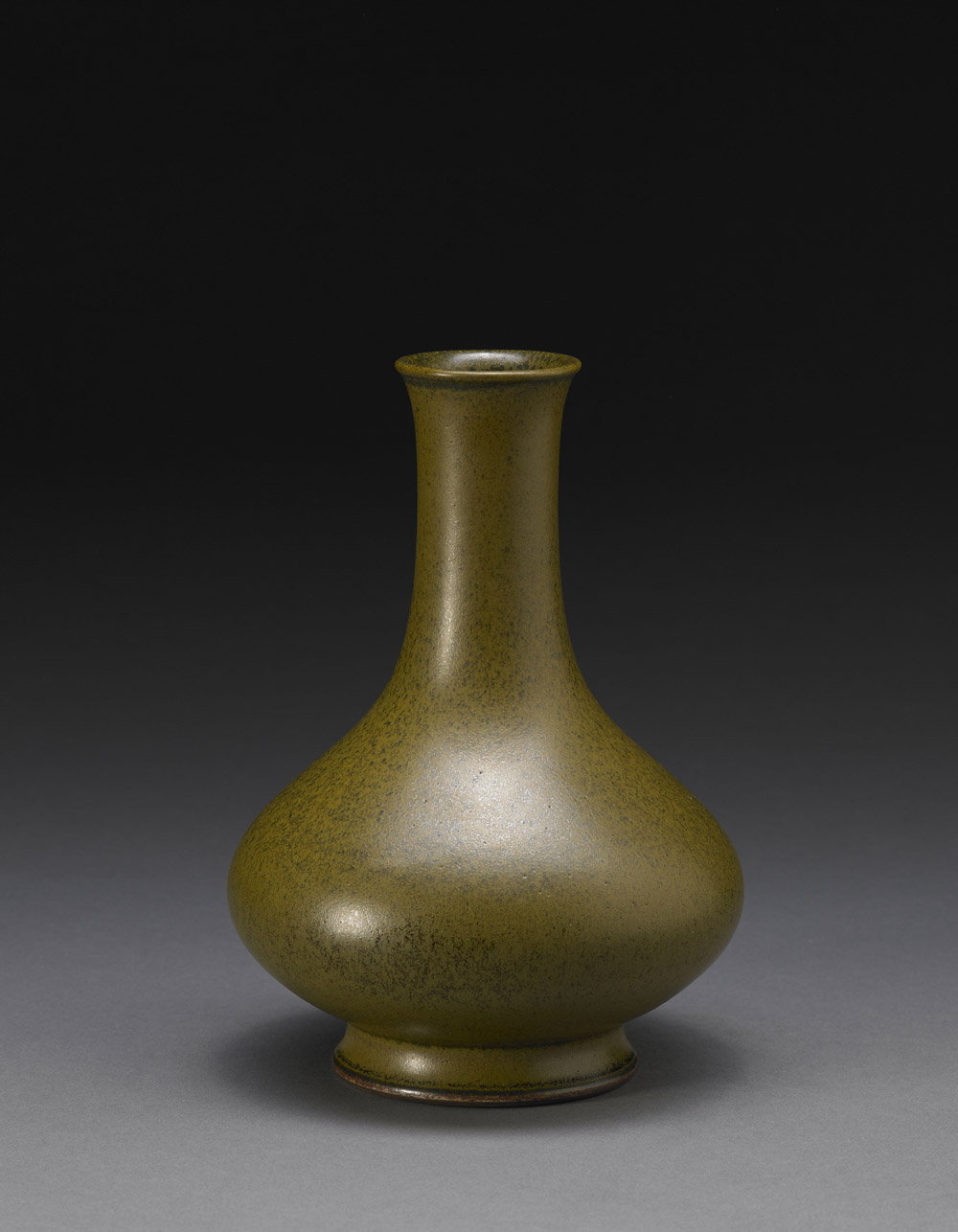 Vaso in porcellana di forma "biqi" con smalto di color verde "teadust", marchio apocrifo Yongzheng a quattro caratteri Cina, dinastia Qing (1644-1911) A teadust porcelain vase of biqi form, apocryphal Yongzheng four character mark China, Qing dinasty (h cm 21)