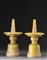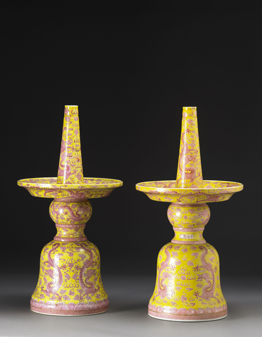 Due portacandele in porcellana con base a campana, decorati in rosa su fondo giallo con numerosi draghi dai cinque artigli in cerca della perla sacra, tra nuvole e lingue di fuoco, i bordi ornati con decorazioni geometriche, iscrizione arcaica (alcune aree con difetti e piccolo restauro sul bordo) Cina, periodo Guangxu (1875-1908) Two porcelain candle holders, with bell-shaped base, each decorated on pink on a yellow ground with numerous five-clawed dragons chasing the flaming pearls amongst clouds and fire spirals, the borders with key-fret bands, archaic script inscription (minor losses and ones all repair to the rim) China, Guangxu period (1875-1908) (h cm 49,5)