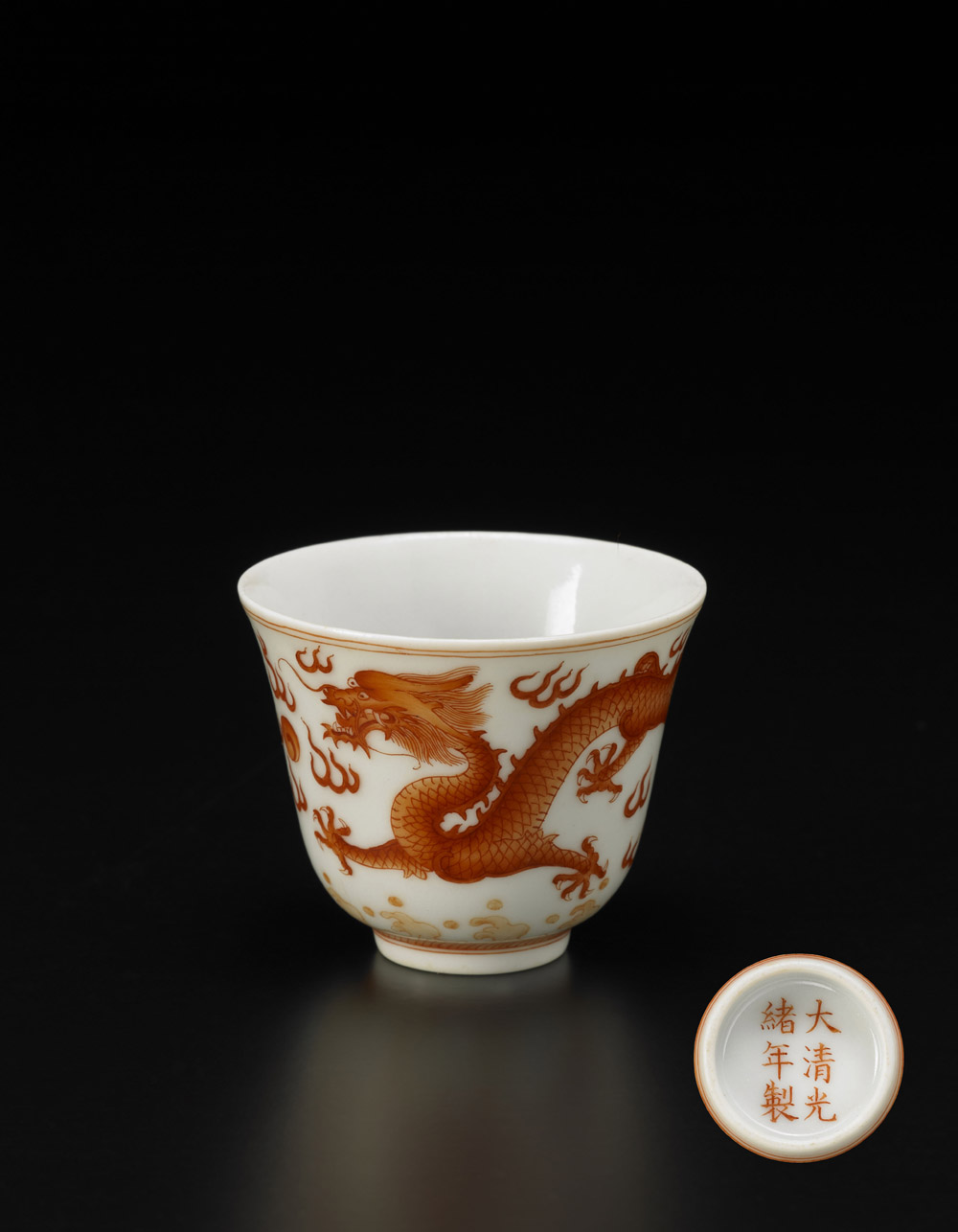 Piccola coppetta in porcellana decorata all'esterno in rosso ferro su fondo bianco con due draghi dai cinque artigli che inseguono la perla sacra, tra nuvole e spirali di fuoco, al di sopra di una banda con onde stilizzate China, marchio Guangxu a sei caratteri in rosso ferro alla base e del periodo (1871-1908) An iron-red porcelain cup decorated to the exterior with two five-clawed dragons chasing the flaming pearl amongst waves and fire spirals, above a band of stylised waves China, Guangxu six-character mark in iron red to the base and of the period (1871-1908) (diam. cm 6)