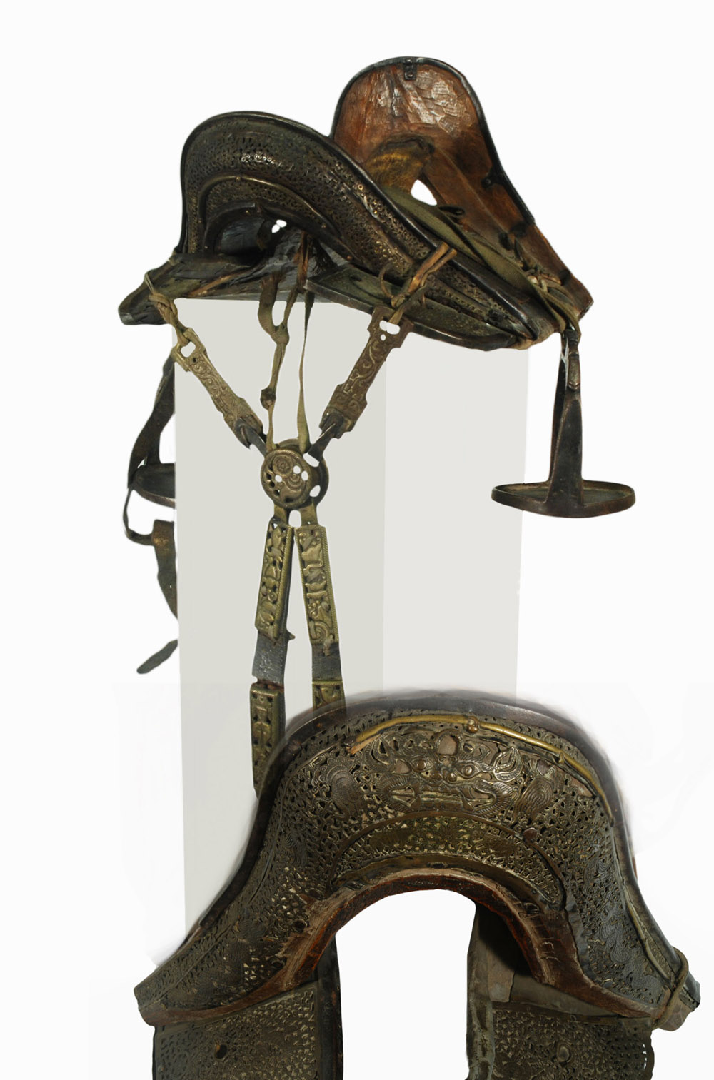 Antica sella tibetana in pelle con finimenti in metallo e bronzo traforati ed incisi An ancient Tibetan leather saddle and metal harnesses