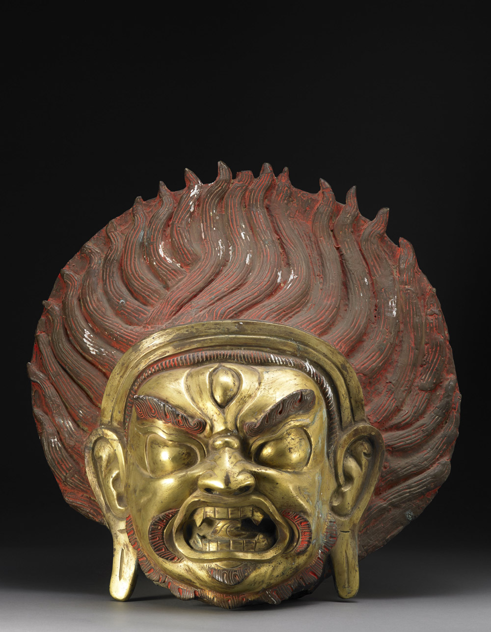 Testa di divinità in bronzo dorato, il volto dall'espressione feroce, una smorfia rivela i denti appuntiti, i capelli scomposti laccati in rosso Cina, XVIII/XIX secolo * Lotto assogettato a regime di IVA ordinaria A gilt bronze head of a guardian god, depicted with a ferocious expression revealing his fangs, the long, wavy hair lacquered in red China, 18th/19th century (h cm 66)