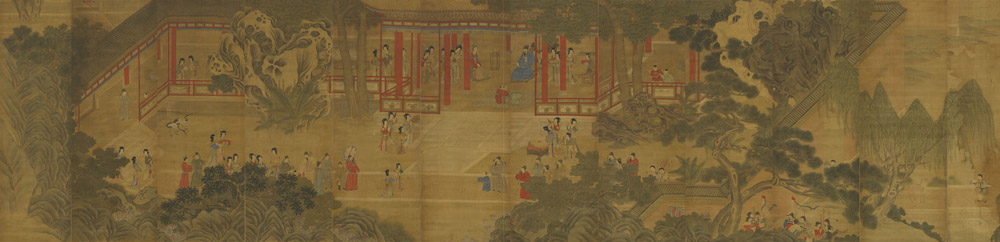 Set di dodici dipinti di una scena unica suddivisa, raffigurate in varie scene raffiguranti figure in contesti di palazzo, in processione, in esterni, con scatola in legno a tre cassetti Inchiostro e colore su seta Cina, sec. XIX A set of twelve paintings of a continuous scene divided depicting figures in various scenes, in interiors, in procession, in exterior involved in various activities, with wood tiered box Ink and colours on silk China, 19th century (cm 152x54,5)