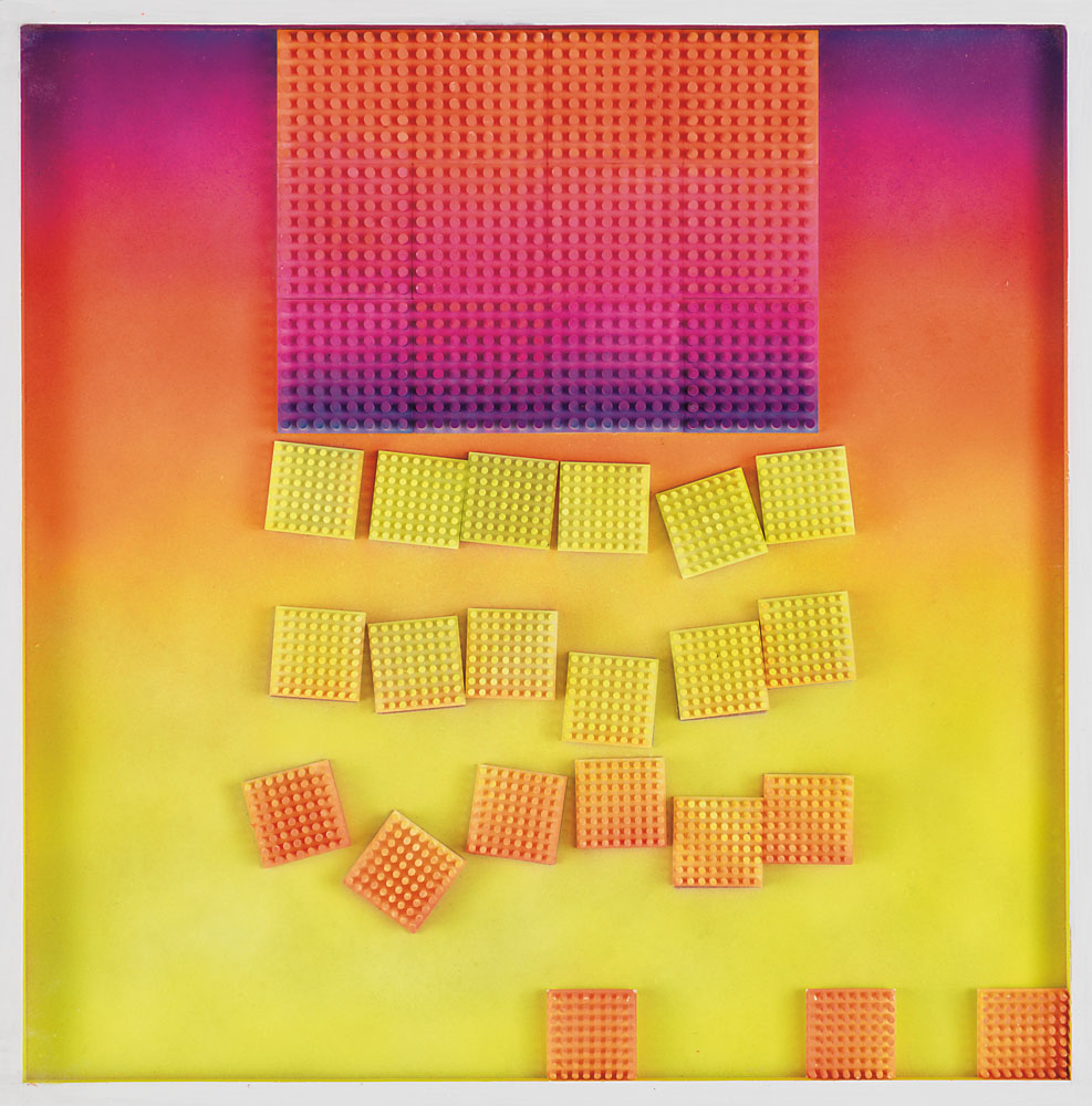 FRANCO COSTALONGA Venezia 1933 Destrutturazione, 1998 gradienti di luminosità (plastiche) e acrilici su masonite cm. 50x50, firma, anno, titolo e timbro dell'artista al retro, dichiarazione di autenticità dell'artista e timbro della Anti: Galleria d'Arte Contemporanea (Mestre-VE) su foto.