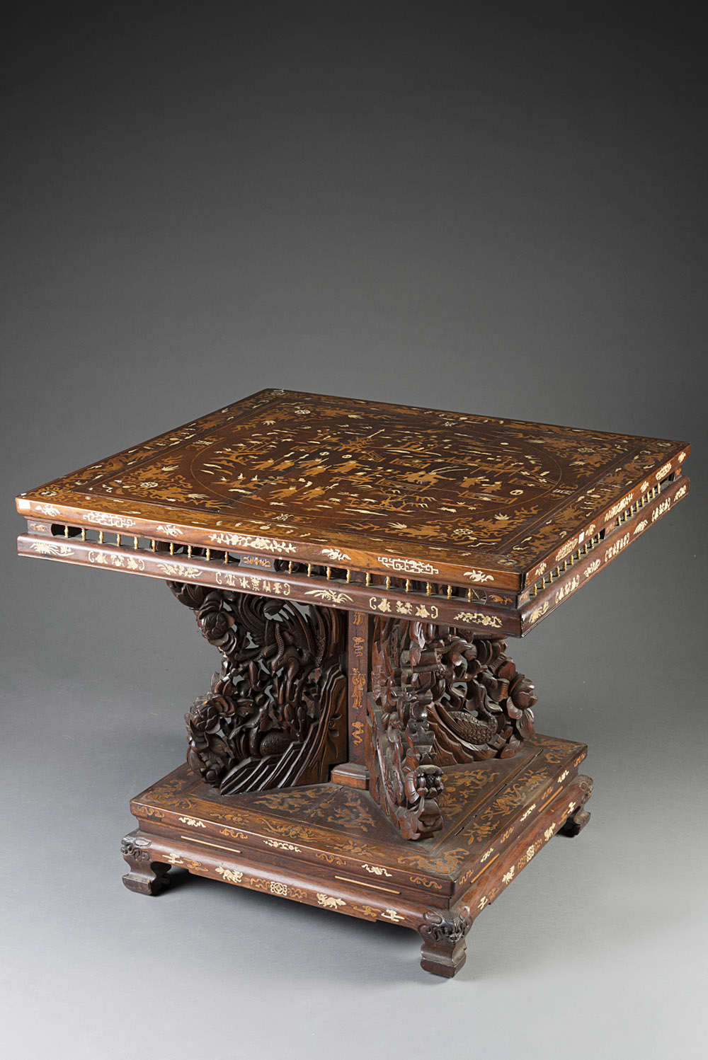 Tavolo quadrato riccamente intarsiato in osso con piano decorato al centro con soldati in un giardino popolato di creature mitologiche e draghi sul bordo. Poggiante su base squadrata con dragoni e leoni buddhisti, piedi intagliati all'attacco. Cina, fine sec. XIX - inizio sec. XX (h cm 79; d cm 92) (difetti e mancanze) Richly decorated table inlaid with bone. China, late 19th - early 20th century (defects and losses)