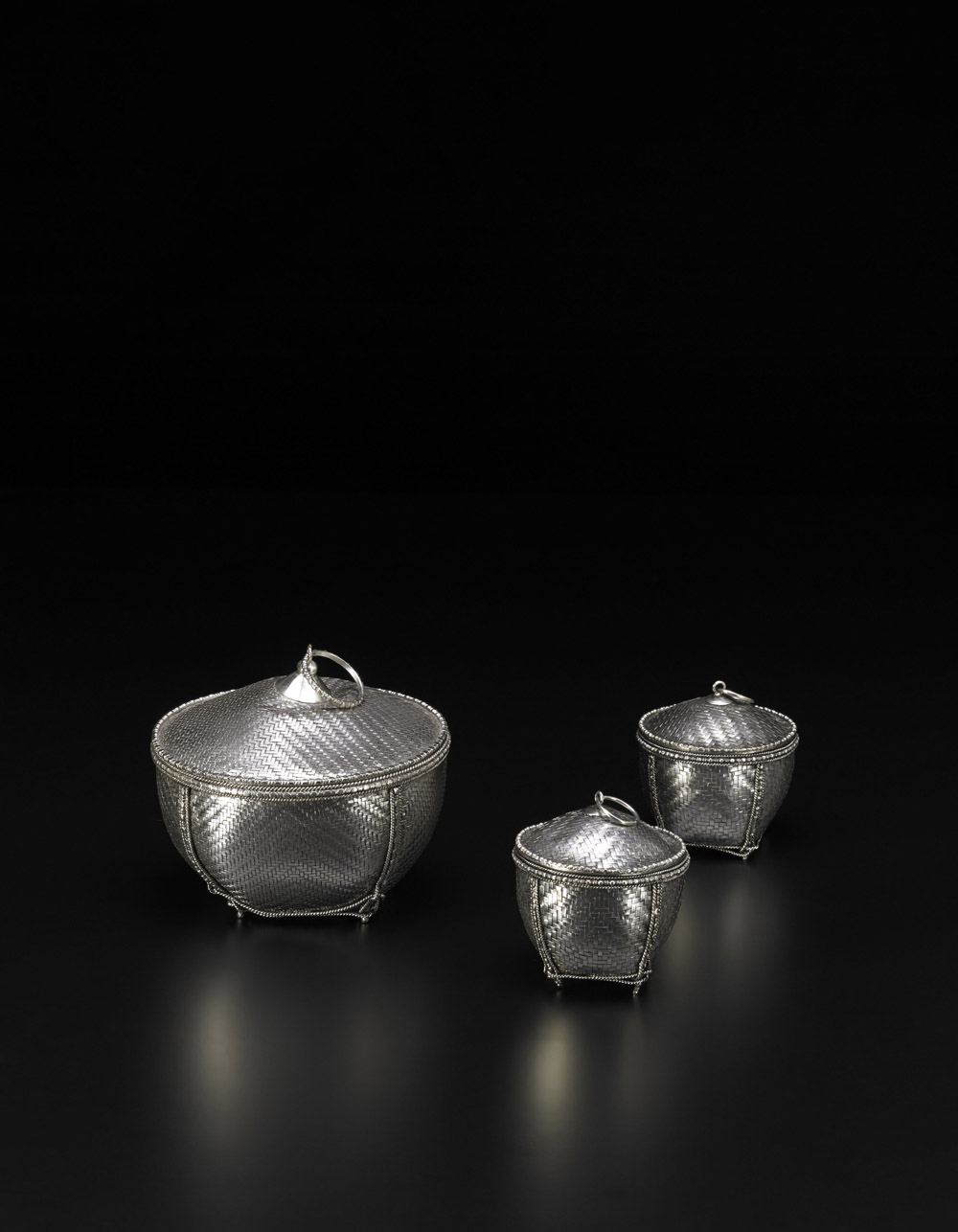Tre piccole scatole in argento lavorato a lamelle flessibili, a forma di piccoli canestri Cambogia, prima metà sec. XX Three small silver boxes shaped and woven baskets Cambodia, first half of 20th century (h max. cm; gr 110, 220, 110)