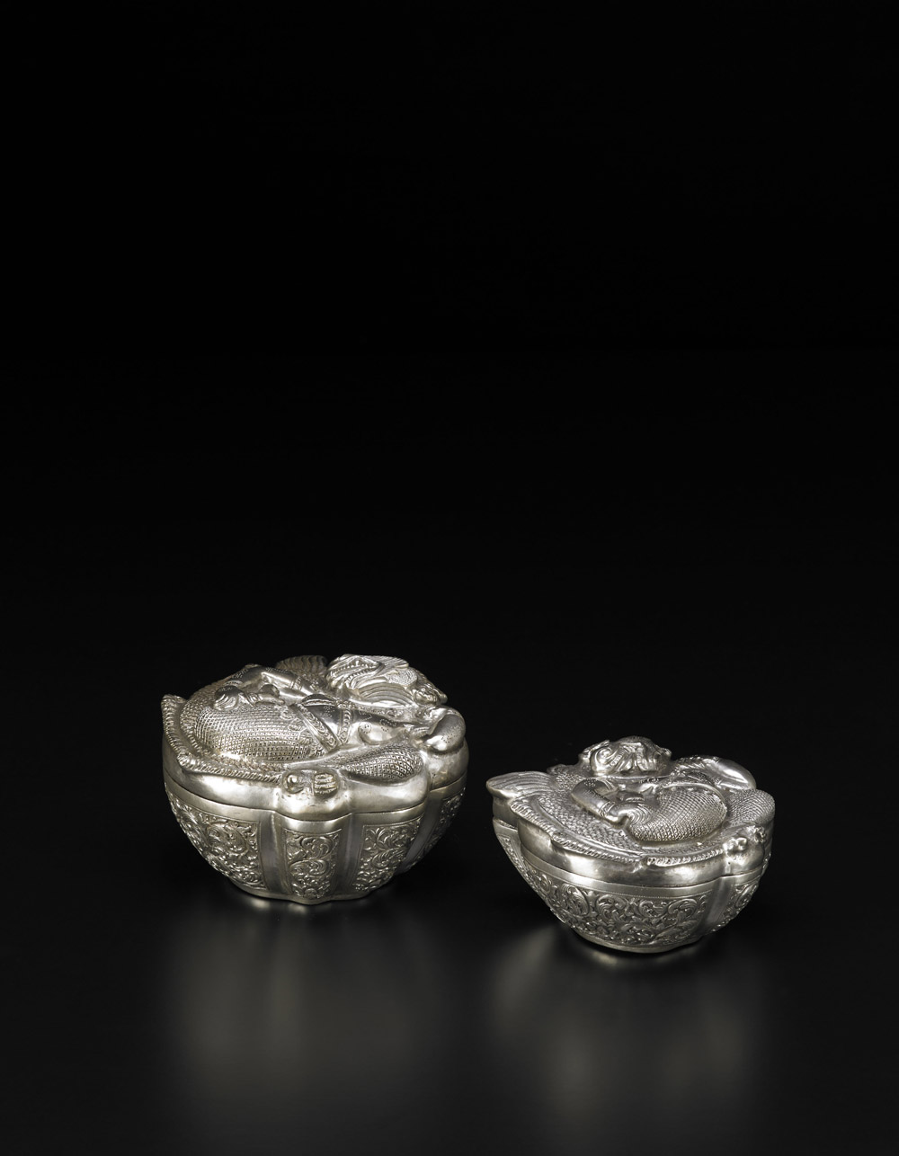 Coppia di scatole in argento lavorate a sbalzo e cesellate, con decorazione di animali mitologici Cambogia, prima metà sec. XX A pair of silver boxes shaped as mythical creatures Cambodia, first half of 20th century (diam. cm 11, gr 260 e 180)