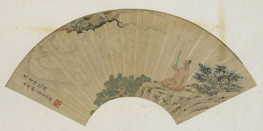 Dipinto su ventaglio raffigurante un monaco dalla testa rasata, seduto su una roccia, nel cielo un drago avvolto da nuvole, accompagnato da calligrafia e sigillo, montato su seta, con cornice Inchiostro e colore su carta Cina, XIX/XX secolo A fan painting depicting a bald monk seating on a cliff, a dragon covered by clouds in the sky, with calligraphy and seal, mounted on silk, framed and glazed Ink and colours on paper China, 19th/20th century (cm 52,5x24)