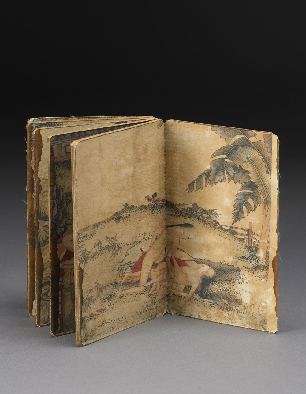 Piccolo album a fisarmonica di dipinti a tema erotico, realizzati con inchiostro e colore su seta montati su carta Cina, sec. XX A concertina album of erotic paintings, each realised in ink and colour on silk mounted on paper China, 20th century (cm 18,5x12,5)