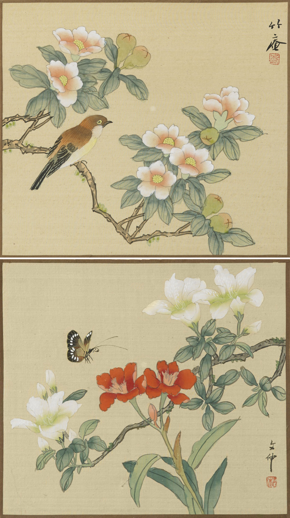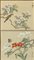 Coppia di dipinti con rami fioriti con uccelli e farfalla in volo, con firma...