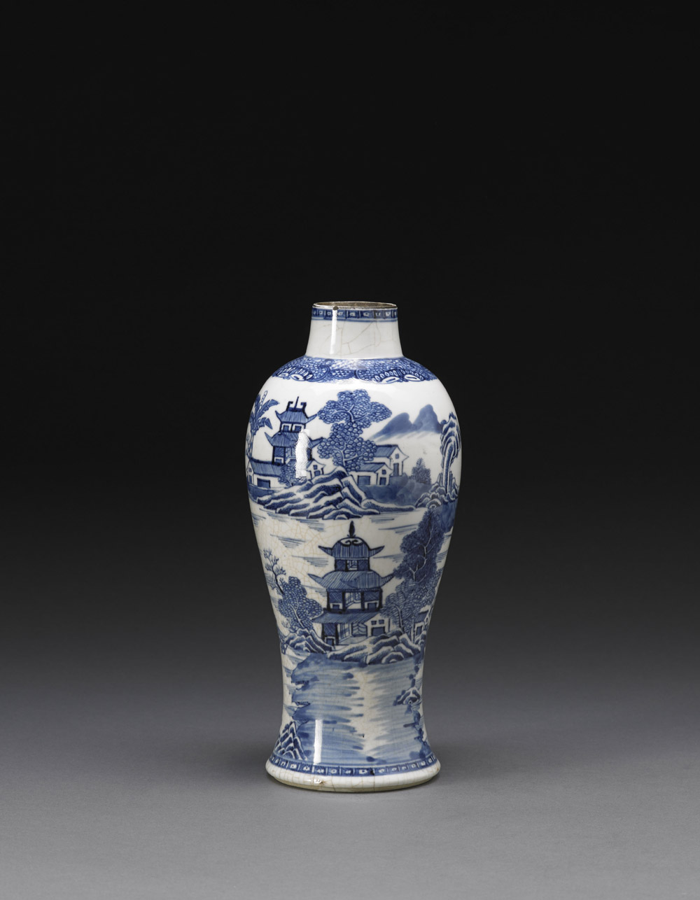 Piccolo vaso a balaustro in porcellana bianca e blu decorato con scena di continuo di paesaggio con montagne e fiumi Cina, sec. XIX A small blue and white baluster vase, painted with a continuous landscape scene with rivers and mountains China, 19th century (h cm 25)