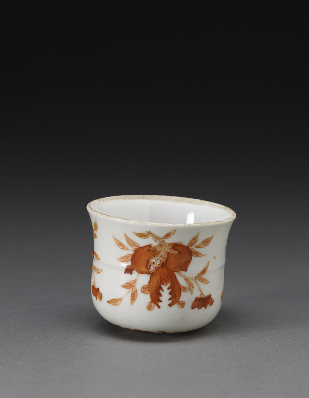 Piccolo coperchio in porcellana rosso ferro decorato con melograni maturi e...