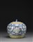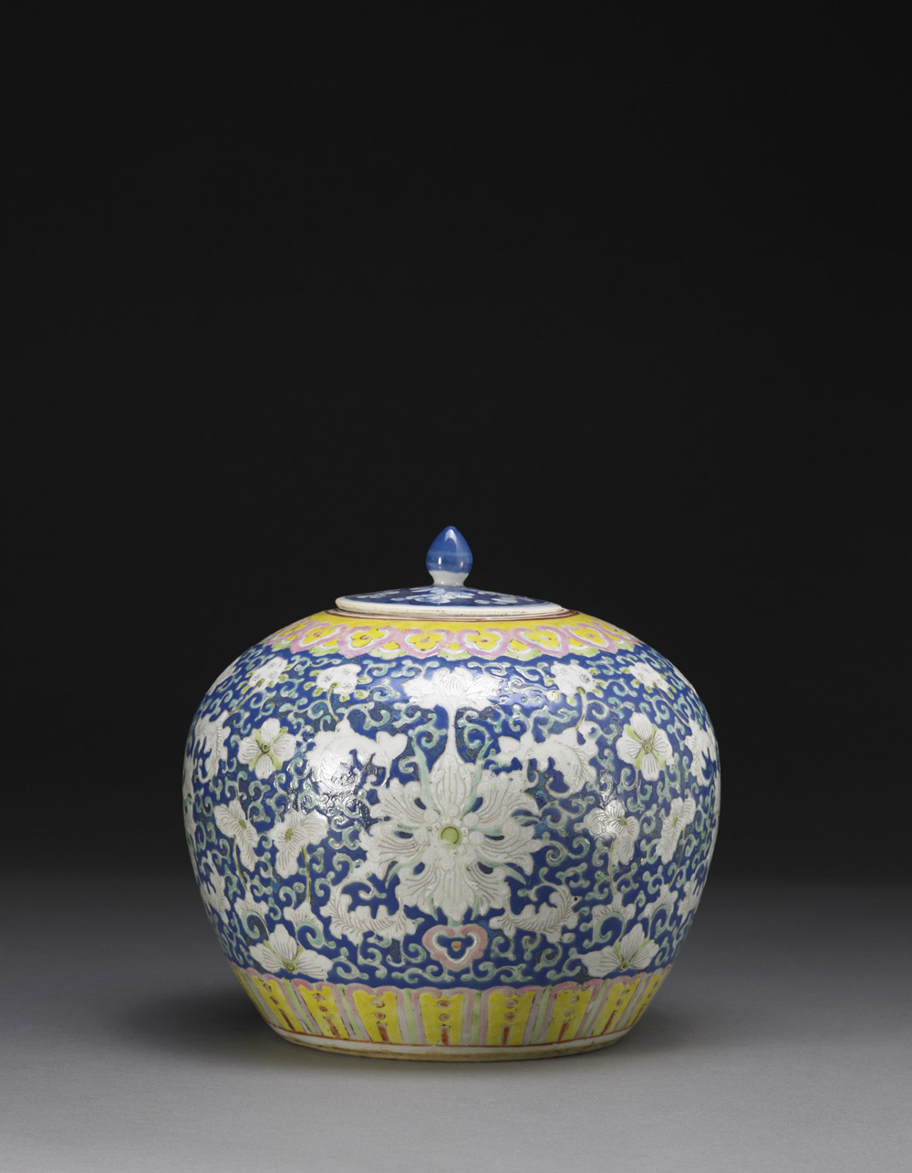 Piccola giara con coperchio in porcellana Famiglia Rosa su fondo blu, decorata con fiori di loto e foglie, tra due bordi con decorazione in giallo Cina, sec. XX A small Famille Rose blue-ground porcelain jar, decorated with lotus flower and foliage within two yellow decorative borders China, 20th century (h cm 22)