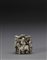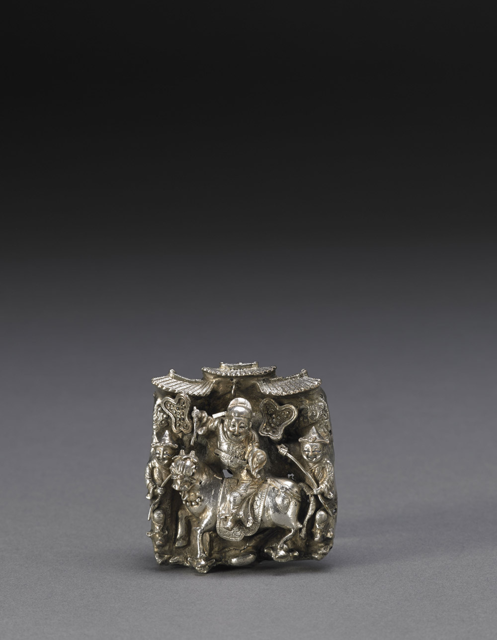 Piccola placca quadrata in argento sbalzato decorata con figura a cavallo accompagnata da un servitore Cina, tarda dinastia Qing, XIX/XX secolo A small squared silver plaque decorated with a figure on a horse with an attendant China, late Qing dynasty, 19th/20th century (cm 5x5)