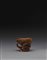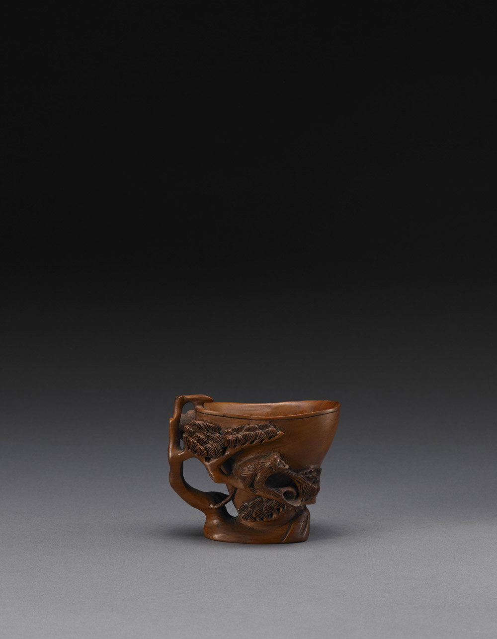 Piccola coppa da libagione in legno intagliato con un cavallino rampante e una scimmia sotto un albero di pino il cui tronco elegantemente forma il manico Cina, sec. XX A wood libation cup carved and pierced with a horse and a monkey beneath pine trees, the handle formed by a tree trunk China, 20th century (h cm 9)