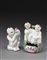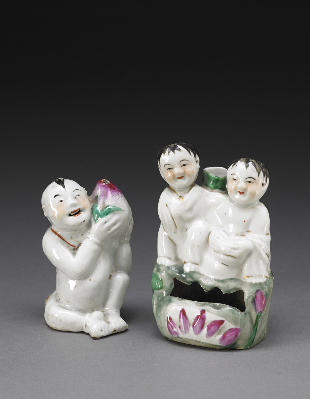 Lotto composto da un portainchiostro in porcellana policroma con due fanciulli su fiore di loto e un piccolo fanciullo con una pesca Cina, XIX/XX secolo * Lotto assogettato a regime di IVA ordinaria A porcelain polychrome inkwasher with two boys seating of a lotus flowers and a small boy with a peach China 19th/20th century (h max. cm 14)