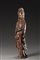 Guanyin in legno scuro, con capelli raccolti, lunga veste che si apre sul petto scoprendo due collane, nella mano destra una pergamena arrotolata Cina, XIX/XX secolo A dark wood figure of a Gunayin, carved standing, with tired hair, long robes revealing a chest with beaded jewellery, holding a scroll in the right hand China 19th/20th century (h cm 18,5)