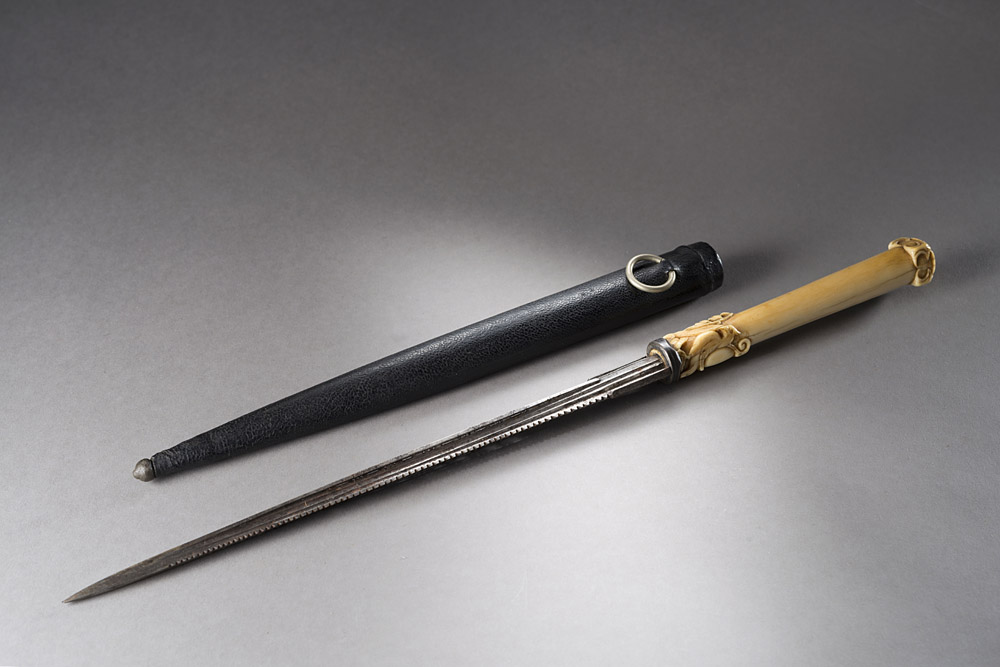 Pugnale con manico in avorio intagliato ad aquila bicefala e mughino. Lama traforata e zigrinata. Fine sec.XVIII. Fodero in pelle di epoca posteriore (difetti) A dagger with ivory handle with a two-headed eagle (defects) Late 18th century (l cm 38)