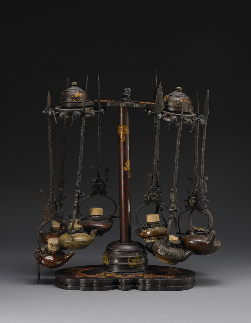 Nove lampade ad olio in terracotta con braccio in metallo ad arpione per sospensione Cina/Tibet, XIX/XX secolo Nine terracotta oil lamps with a long metal hook for suspension China/Tibet, 19th/20th century (h cm 40)