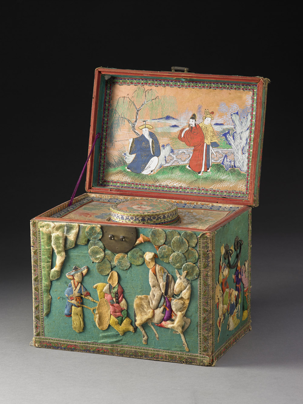 Scatola per il tè in legno rivestito di seta e decorato con figure policrome a rilievo con all'interno un contenitore metallico con coperchio, rivestito di carta e seta dipinta a fiori. Manici e chiusura in bronzo (difetti) Cina, sec. XIX A silk mounted wood tea box, containing a metal jar inside. China, 19th century (defects) (cm 21,5x25,7x18,5)