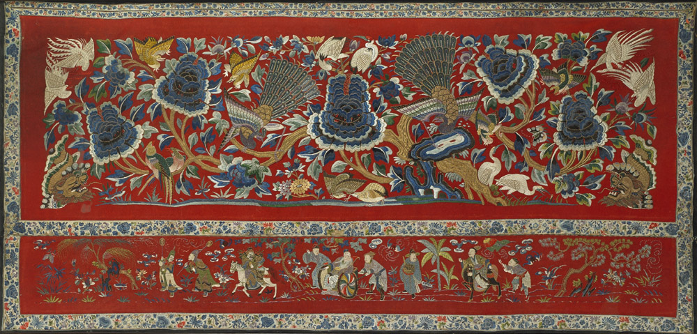Tessuto ricamato con fili azzurri e blu su fondo rosso, decorato con uccelli e rami fioriti Cina XIX/XX sec. An embroidery of various birds and flowering branches in blue threads on a red ground China, 19th/20th century (cm 95x198)