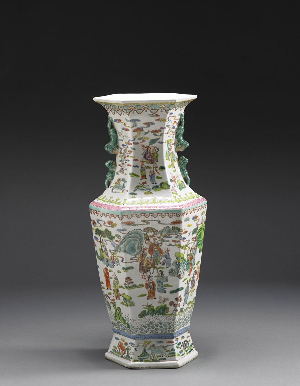 Grande vaso esagonale a balaustro in porcellana Famiglia Rosa con due anse leonine decorato con varie figure in varie attività su fondo chiaro Cina, sec. XX A large hexagonal Famille Rose baluster vase with twin lion head handles, enamelled with numerous figures in activities on a light ground China, 20th century (h cm 85)