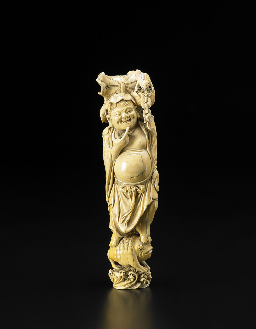 Scultura in avorio raffigurante Liu Hai in piedi, con volto sorridente e vesti morbide che si aprono sul torso abbondante, con una mano tiene una foglia di loto, accompagnato da rospi a tre gambe, la base decorata con onde (mancanze e rotture) Cina, XVII/XVIII secolo An ivory figure of a standing Liu Hai, with a smiling face and wearing long robes opening on his protrudent belly, holding a lotus leaf, accompanied by three-legged toads, the base with foaming waves (some losses) China, 17th/18th century (h cm 20)