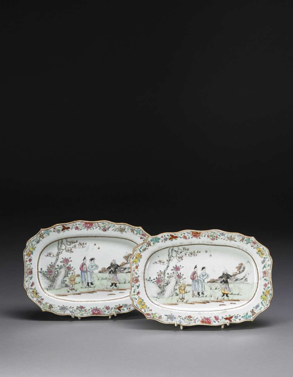 Coppia di piatti in porcellana di forma ovale, in smalti Famiglia Rosa e doratura, decorati al centro con dame, un guerriero e un fanciullo in un giardino con rami in fiore e rocce ornamentali, il bordo sagomato decorato con fiori e frutti (difetti) Cina, seconda metà sec. XVIII A pair of Famille Rose oblong dishes, each enamelled and gilt with a central scene of ladies, a warrior and a boy in a garden beside flowering branches and pierced rocks, the shaped border with flowers and fruits (defects) China, second half of the 18th century (l cm 27)