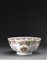 Grande bacile in porcellana Famiglia Rosa e doratura, a decoro armorial, con grande stemma centrale recante motto NOMEN HONOR CVE MEIS, fiori e decorazioni geometriche (mancanze minime agli smalti) Cina, seconda metà sec. XVIII A Famille Rose armorial punch bowl enamelled and gilt with coat of arms with the motto NOMEN HONOR CVE MEIS, flowers and further decorations (some minor losses to the enamels) China, second half of the 18th century (diam. cm 35,5)