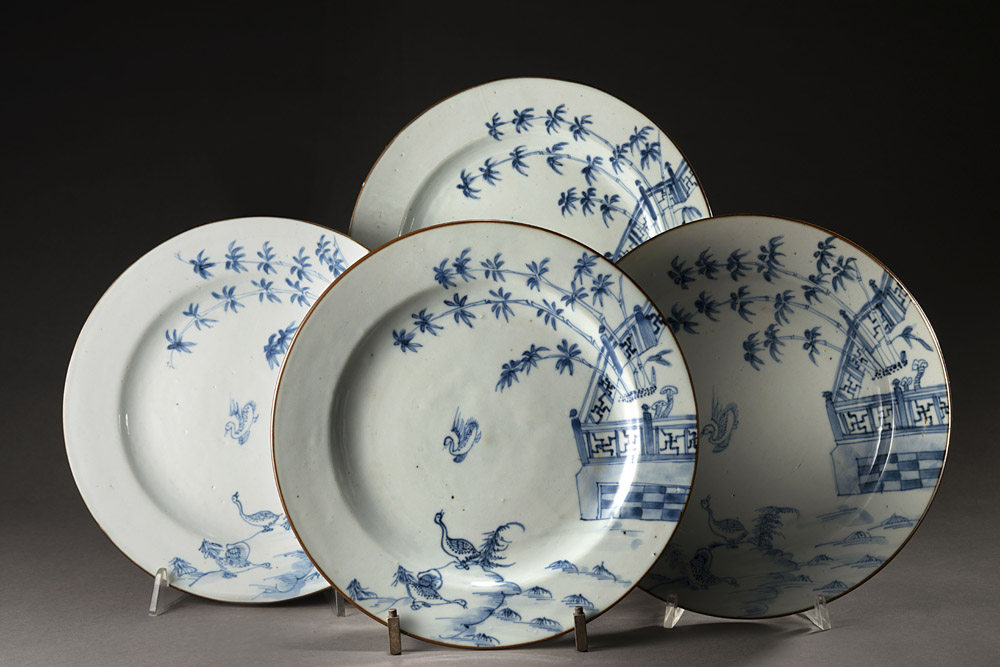 Quattro piatti in porcellana bianca e blu decorati con anatre e terrazza con bambù e lingzhi (alcuni difetti e felure) Cina, metà sec. XVIII Four blue and white porcelain dishes decorated with geese in flight over a terrace with bamboo and lingzhi (minor losses) China, second half of 18th century (diam. cm 23)