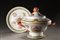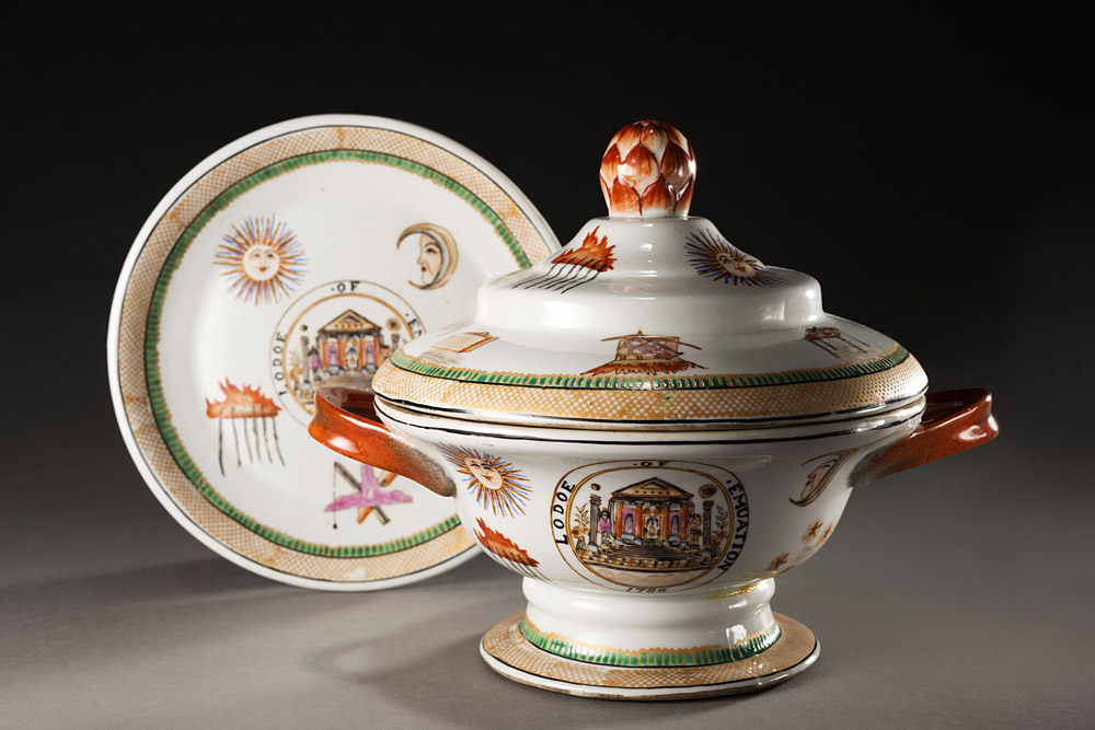 Set di porcellana cinese da esportazione in stile armorial composto da piccola zuppiera con coperchio e vassoio rotondo, decorato con medaglione con motto "LODOE OF EMUATION 1780" e altri simboli associati alla massoneria Cina, dinastia Qing (1644-1911) A Chinese-export armorial porcelain set composed by a small tureen and cover and a circular tray enamelled with a medallion with the motto "LODOE OF EMUATION " and symbols associated with the masonry China, Qing dynasty (il vassoio/the tray diam. cm 16,5)