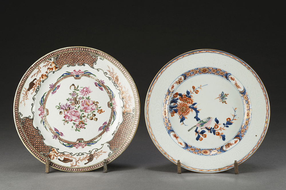 Due piatti in porcellana, uno decorato in Famiglia Rosa cantonese e l'altro in Imari con doratura, decorati con fiori, volatili e foglie (difetti e restauri) Cina, periodo di Qianlong, metà sec. XVIII Two porcelain dishes, one decorated in Cantonese Famille Rose with flowers, birds and geometrical motif; the other in Imari (defects and restorations) China, Qianlong Period, mid-18th century (d cm 22,3)