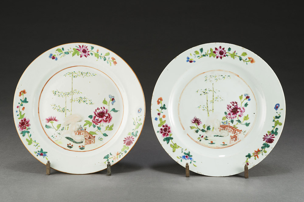 Due piatti in porcellana Famiglia Rosa, decorati con bambù e fiori in un...