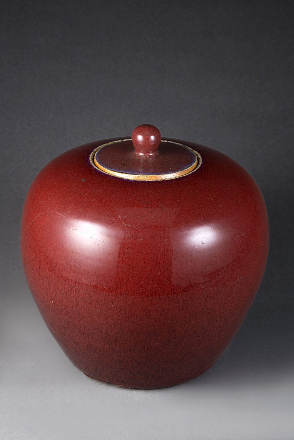 Giara globulare in porcellana con invetriatura monocroma rosso sangue di bue...
