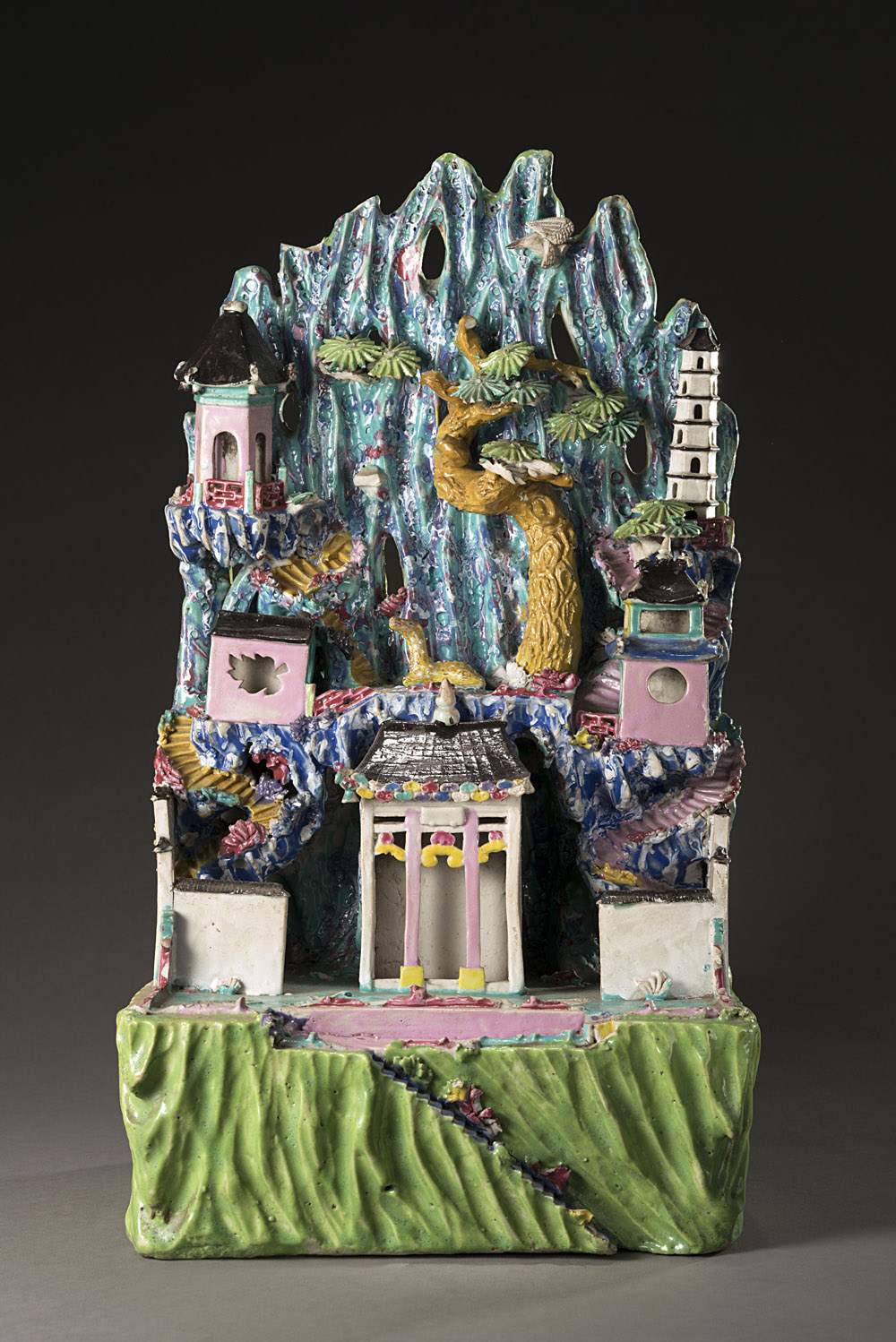 Raro gruppo scultoreo in porcellana smaltata in vividi colori rosa, verde e turchese raffigurante una pagoda centrale inserita in un contesto montuoso abbellito da un cervo a riposo un albero di Pino, un uccello in volo ed altri piccoli edifici (gravi mancanze, difetti e rotture, alcuni ripari) Cina, epoca Qianlong (1736-1795) A rare porcelain group enamelled in bright pink, green and turquoise depicting a central pagoda inset in a mountain with a deer resting underneath a pine tree, a bird in the sky and further small buildings (sever losses, damages and repairs) China, Qianlong period (1736-1796) (h cm 40)