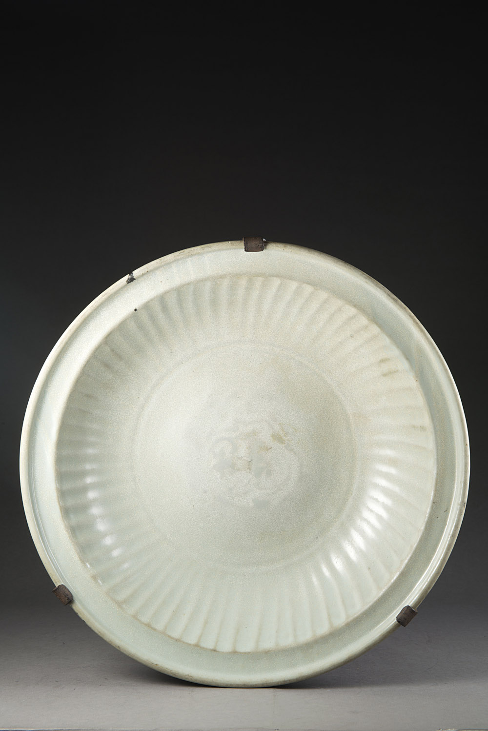 Piatto in grès celadon scuro con parete lobata (piccolo difetto sul bordo) Cina, secc. XIV-XV A celadon plate. China, 14th - 15th century (minor defect on the rim) (d cm 33)
