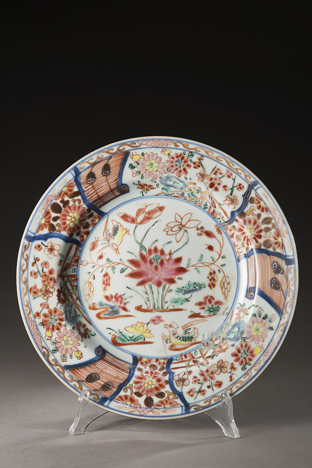 Piatto in porcellana famiglia rosa su fondo bianco e blu, riccamente decorato al centro con anatre mandarine in uno stagno con fiori di loto, il bordo con fiori e riserve con tenda (difetti sui bordi) Cina, prima metà del sec. XVIII A blue and white and Famille Rose dish richly decorated to the centre with mandarin ducks in a lotus pond, the border with flowers and cortouches (minor defects) China, first half 18th century (diam. cm 21,5)