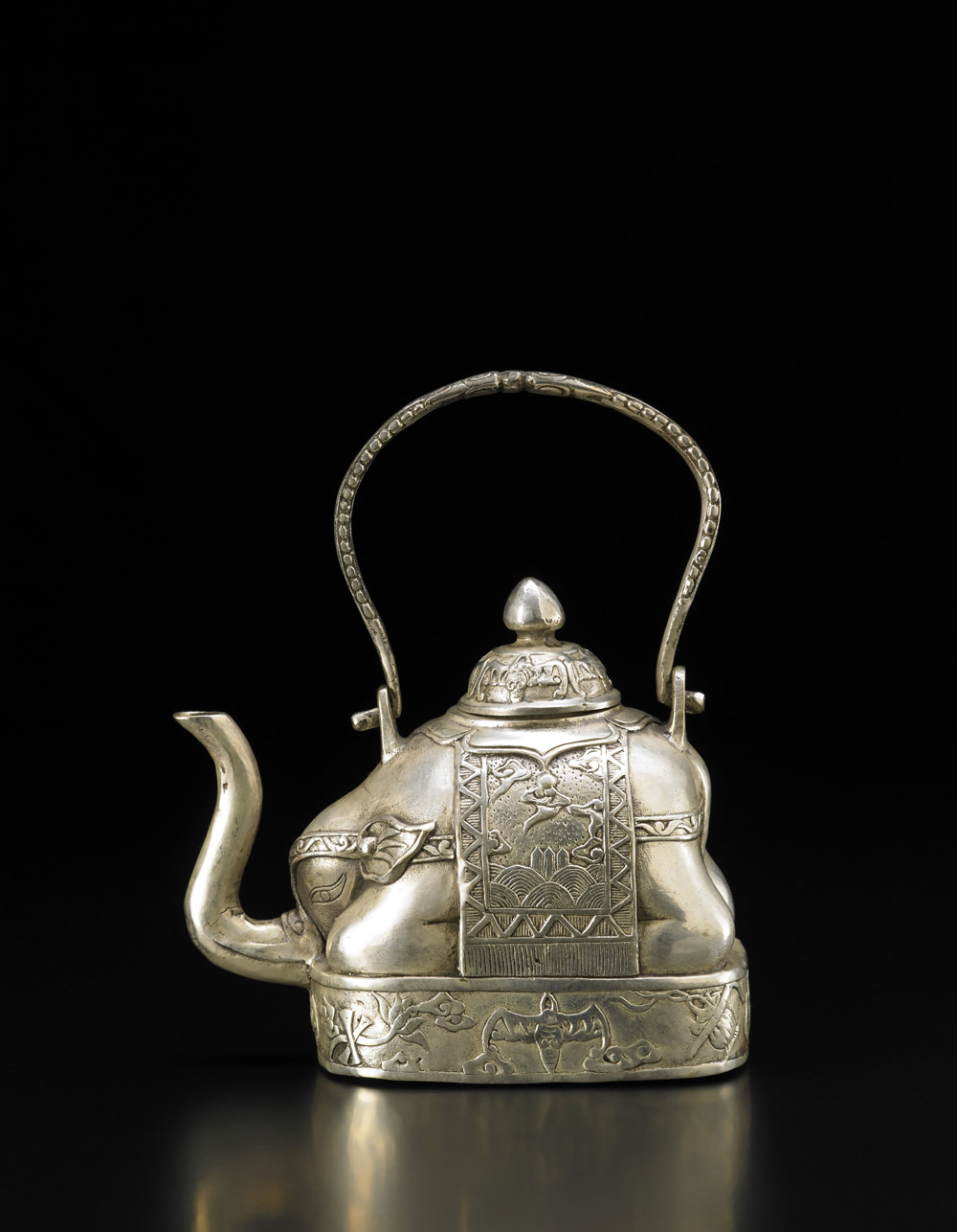 Piccola teiera con coperchio in metallo argentato, a forma di elefante accovacciato su un piedistallo, bardato con finimenti decorati, marchio apocrifo Qianlong alla base Cina, sec. XX A small silver-plated teapot and cover, depicting a recumbenr caparisoned elephant, apocryphal Qianlong mark to the base China, 20th century (l cm 14)