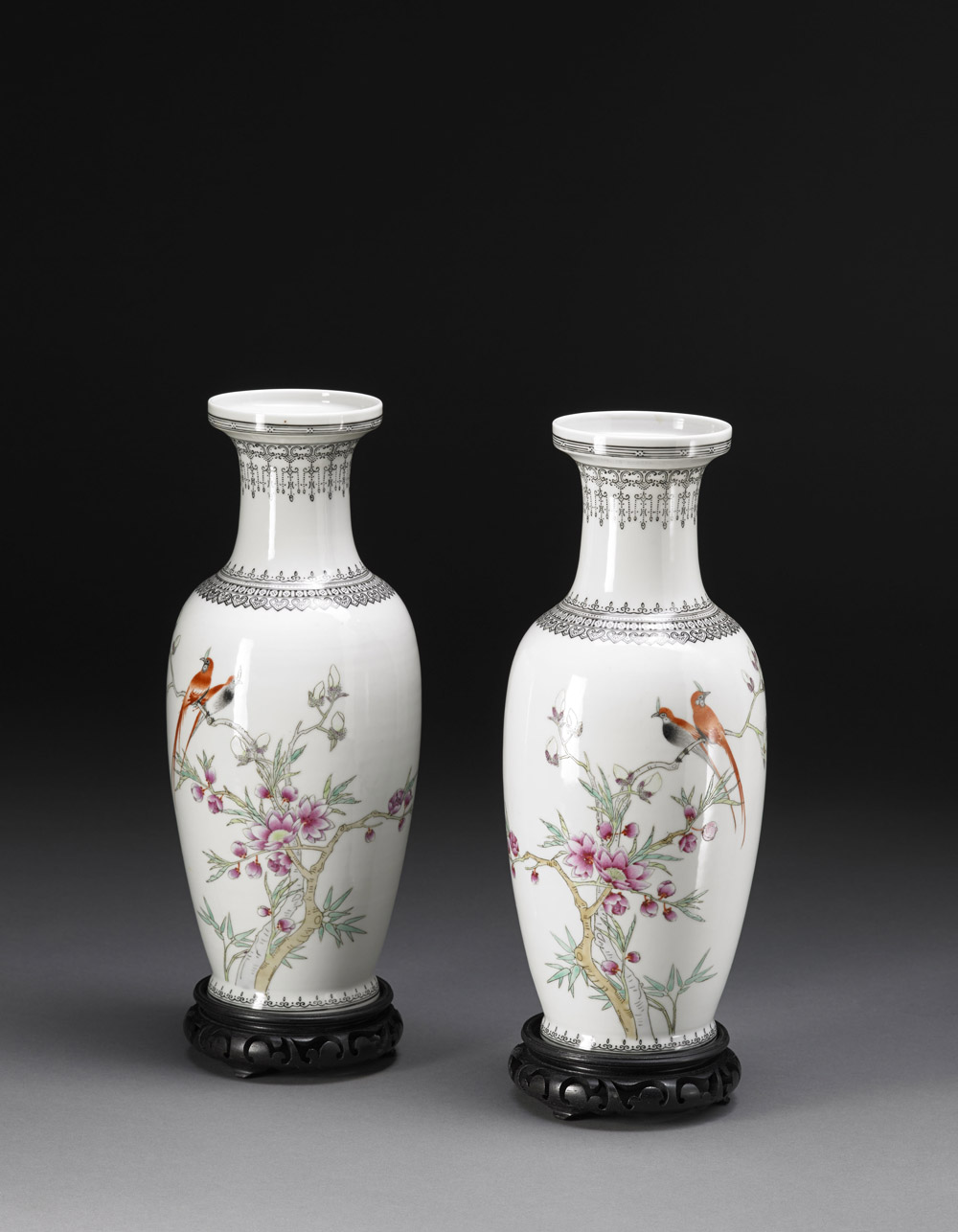 Coppia di vasi in porcellana smaltata, il corpo di forma ovoidale, decorati con uccelli dalla lunga coda su rami fioriti, bordati da teste di ruyi e altri ornamenti, con linee di calligrafia, marchio Jingdezhen alla base Cina, prima metà sec. XX A pair of ovoid vases enamels with long-tailed birds perched on flowering branches, bordered by ruyi heads and other decorative bands, with calligraphy lines, Jingdezhen mark to the base China, first half 19th century (h cm 30,5)