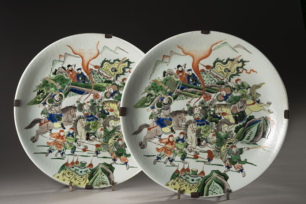 Coppia di piatti in porcellana Famiglia Verde decorata con una movimentata scena di battaglia di guerrieri e cavalieri armati di lance, sullo sfondo un paesaggio montuoso Cina, sec. XIX A pair of Famille Verte porcelain dishes, each decorated with a battle scene involving speared warriors on foot and on horses, against a mountainous landscape China, 19th century (diam. cm 36,5)