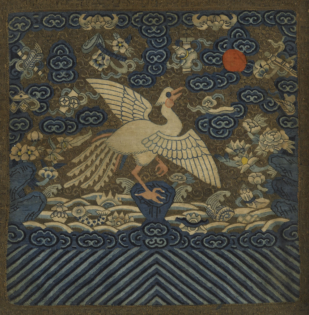 Pettorale in seta ricamata per ufficiale civile di primo rango, decorato con un airone dorato in volo in fili colorati e dorati, con cornice in legno intagliato Cina, tarda dinastia Qing, XIX/XX secolo A silk rank badge for a civil official of the first rank, embroidered in gold and coloured threads with a golden crane in flight, with carved wood frame China, late Qing dynasty, 19th/20th century (cm 25x25)