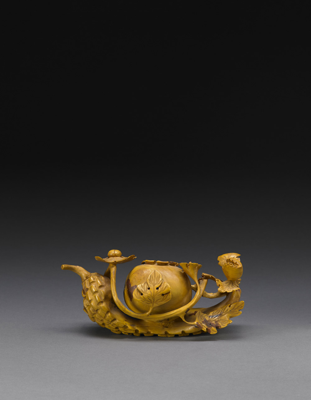 Piccolo portapennelli in legno scolpito raffigurante un melograno circondato da fiori e foglie sulle quali riposa un insetto, la base a forma di baccello (alcune mancanze) Cina, sec. XX A small wood brushpot depicting a fruiting pomegranate, surrounded by flowers and leaves, with a small insect resting, the base in the form a dried fruit China, 20th century (l cm 20)