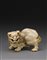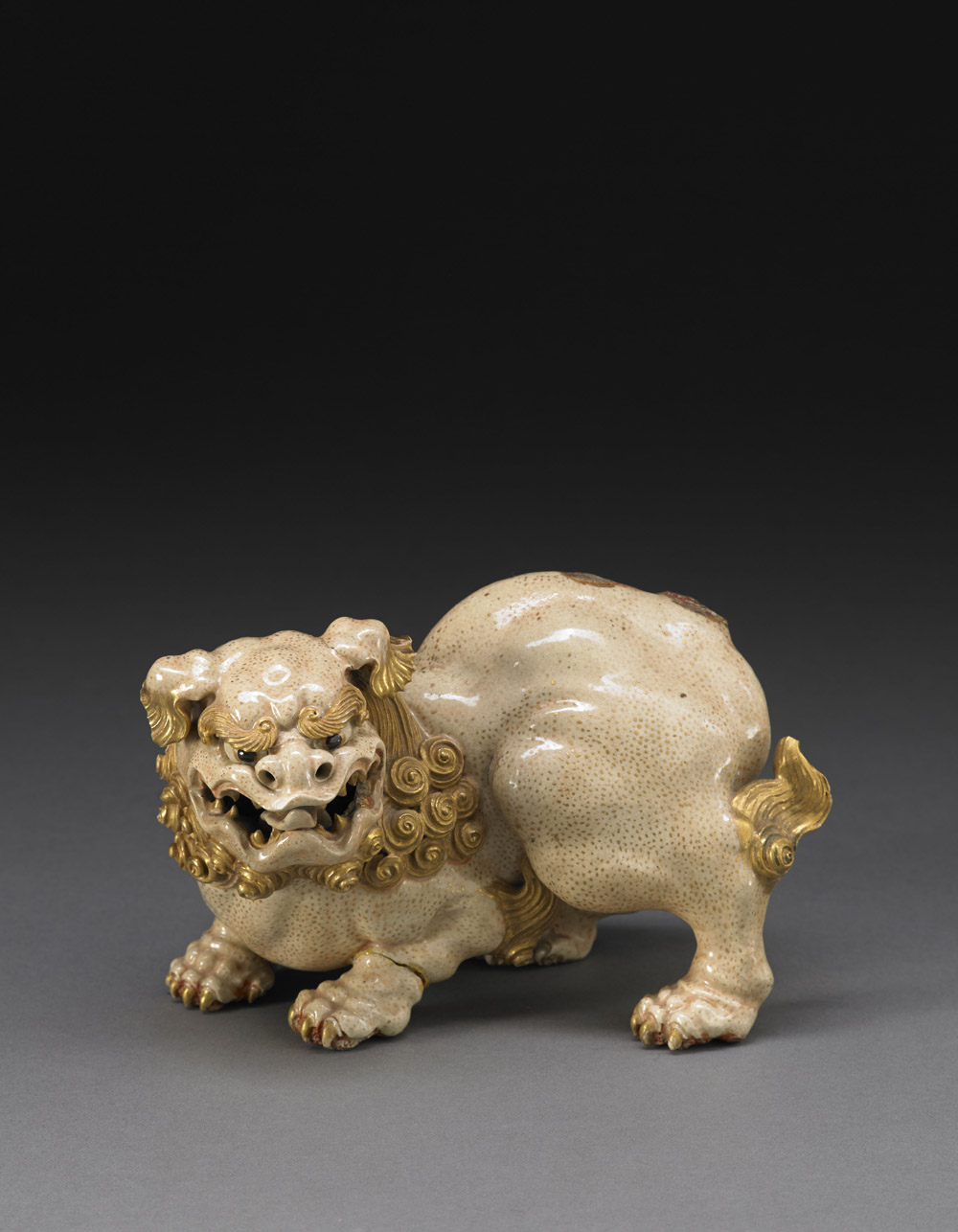 Leone buddhista in porcellana Satsuma, raffigurato accovacciato, con espressione feroce che rivela le zanne, il corpo decorato con dettagli dorati (difetti) Giappone, periodo Meiji (1868-1912) A Satsuma Buddhist lion depicted recumbents with a ferocious expressions revealing the fangs, the body enamelled with details (defects) Japan, Meiji period (h cm 19)