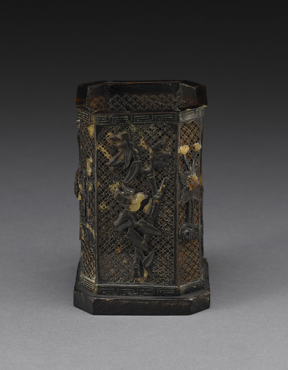 Portapennelli in tartaruga intagliato e traforato, di forma rettangolare con angoli lobati, decorato con fiori, base in legno, Cina, sec. XX A carved and pierced tortoiseshell brushpot of rectangular form with canted corners, decorated with flowers, wood base China, 20th century (h cm 11)