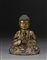 Piccola statua in legno dorato del Buddha raffigurato seduto con le mani...