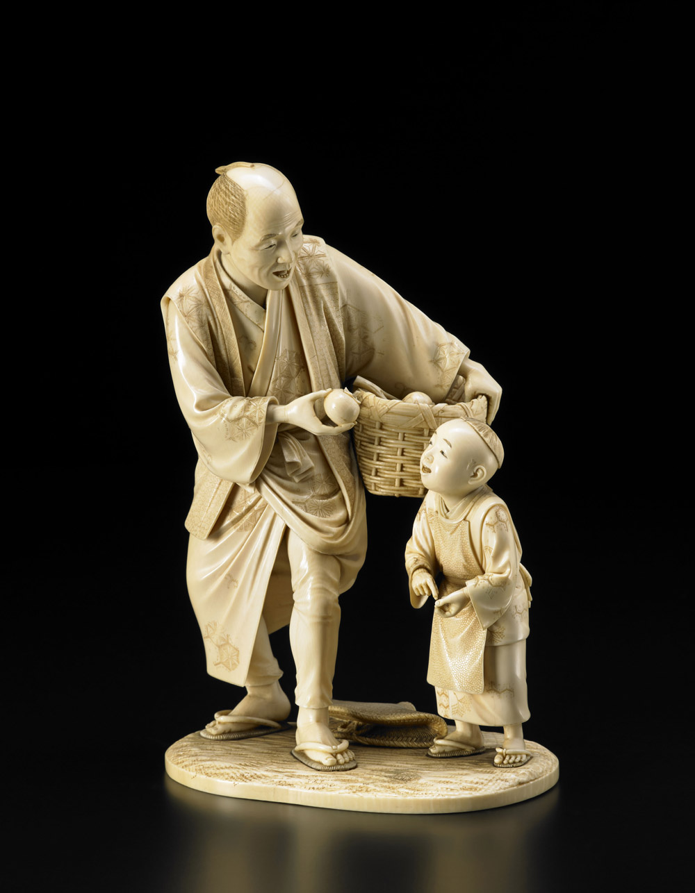 Okimono in avorio su base ovale raffigurante un uomo con un cesto di frutta che offre una mela ad un bambino, entrambe le figure con vesti delicatamente decorate, i dettagli del viso e della capigliatura in nero, firmato in cartiglio rettangolare rosso Giappone, periodo Meiji (1868-1912) Prov.: etichetta Eskenazi Antichità An ivory okimono of a figure carrying a basket of fruit offering an apple to a child, both wearing delicately decorated robes and standing on an oval base, fine black detailing of the hair and the facial features, signed in a red rectangular reserve Japan, Meiji period Provenance: Eskenazi Antichità, label (h cm 23)