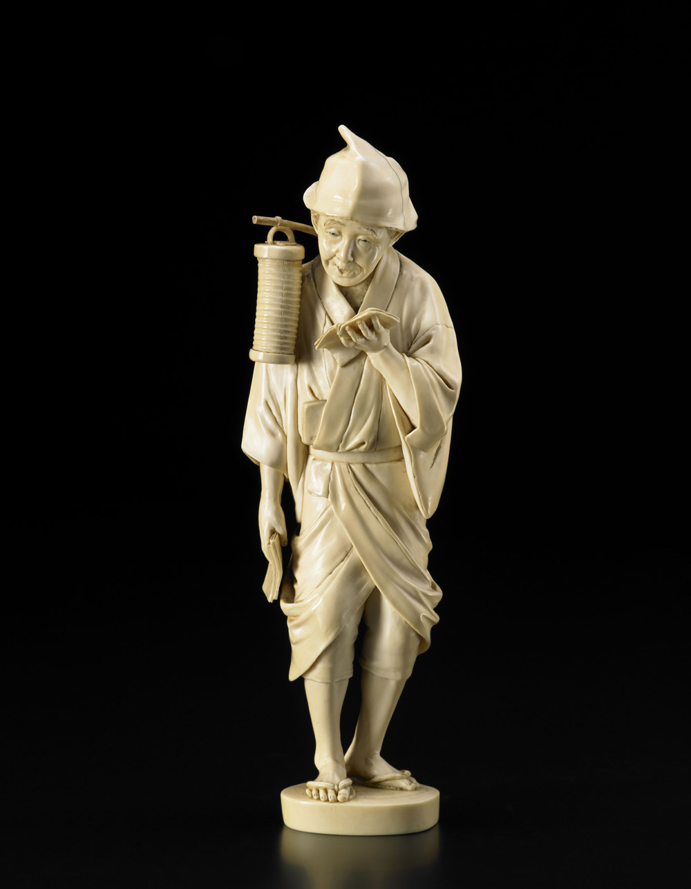 Okimono in avorio raffigurante un poeta con vari manoscritti e con una lanterna poggiante sulla spalla, con copricapo e veste allacciata, dettagli del viso e della capigliatura in nero, firmato sulla base Giappone, periodo Meiji (1868-1912) An ivory okimono depicting a standing man carrying manuscripts and with a lantern on his shoulders, wearing a hat and knotted robes, the hair and facial features highlighted in black, signed to the base Japan, Meiji period (h cm 22)