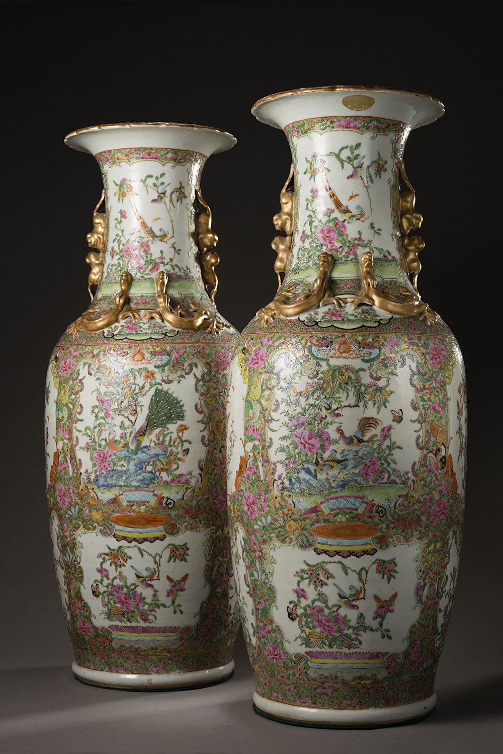 Coppia di vasi in porcellana Famiglia Rosa cantonese, con draghi dorati a rilievo, decorati con vari pannelli con figure, fiori e uccelli, su fondo bianco e dorato (uno danneggiato e restaurato nella parte superiore) Cina, sec. XIX A pair of Cantonese Famille Rose porcelain vases, with dragons applied to neck, decorated in gilt and enamels with panels enclosing figures, flowers and birds (one with a crack to the mouth, one section restored) China, 19th century (h cm 65)